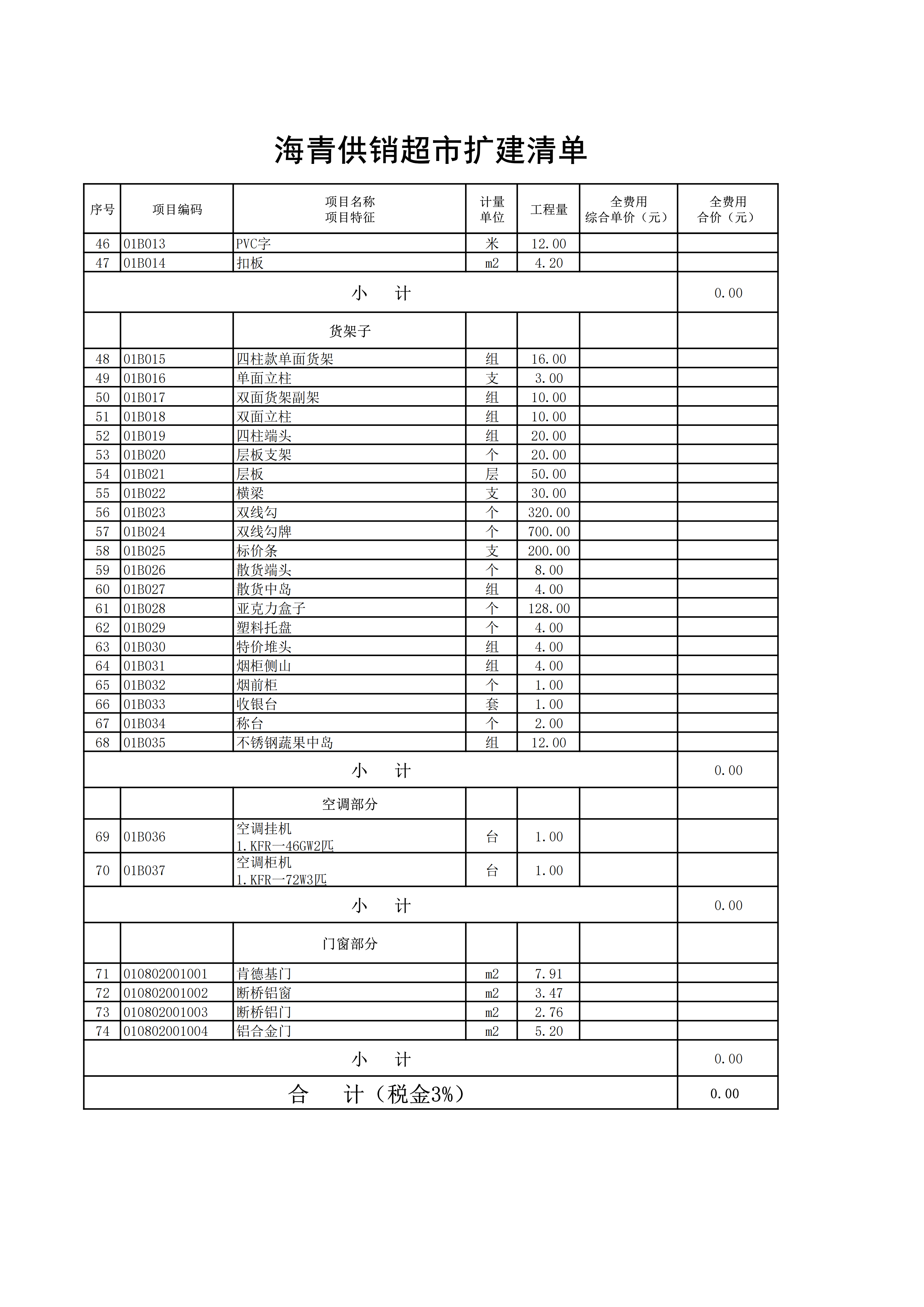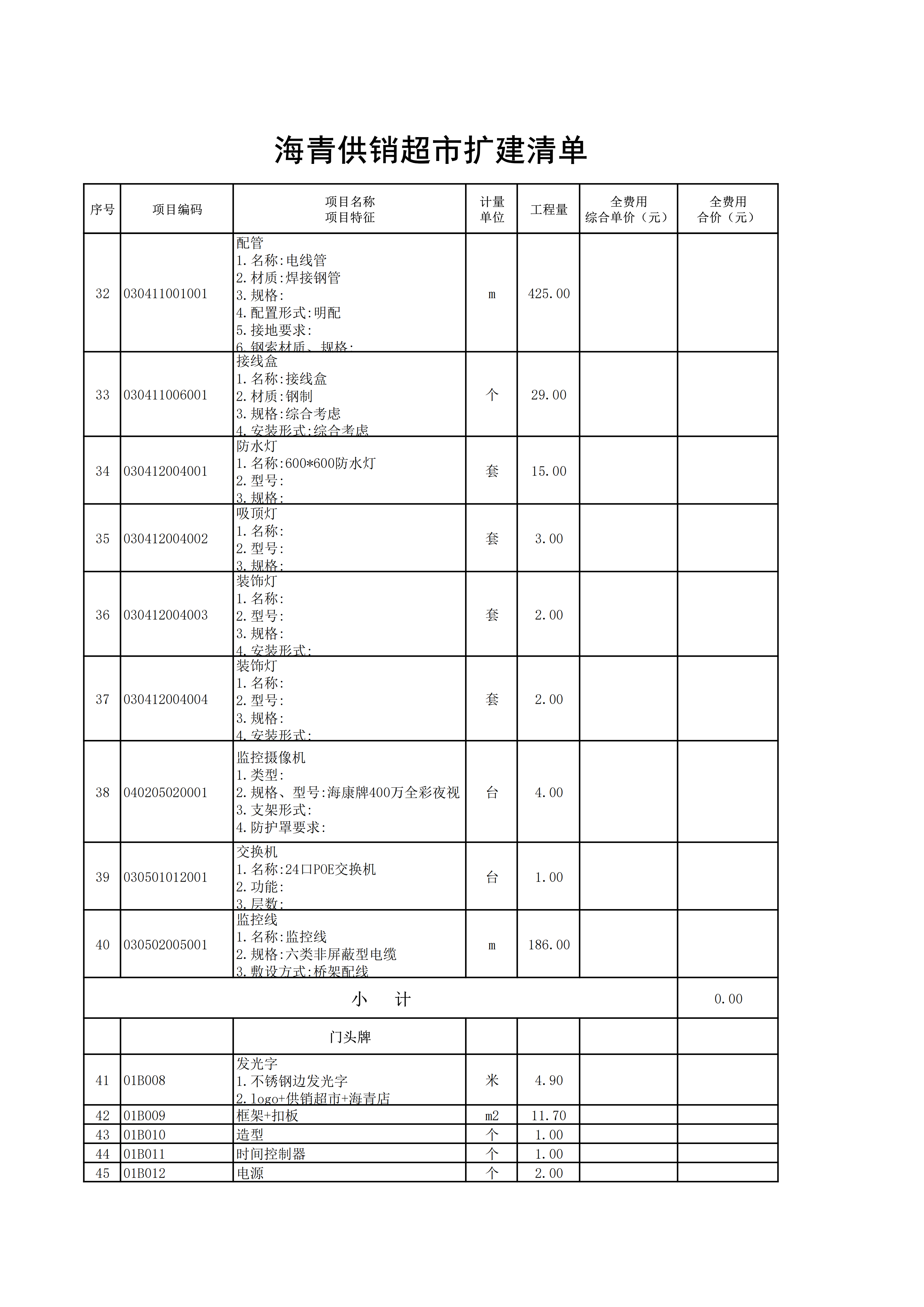 海青供销超市扩建需拆除原有的地台、间隔墙、门;室内铺设瓷砖,吊顶,墙面粉刷腻子,更换电线,安装摄像头,制定门头牌,安装货架,安装空调,更换门窗等。