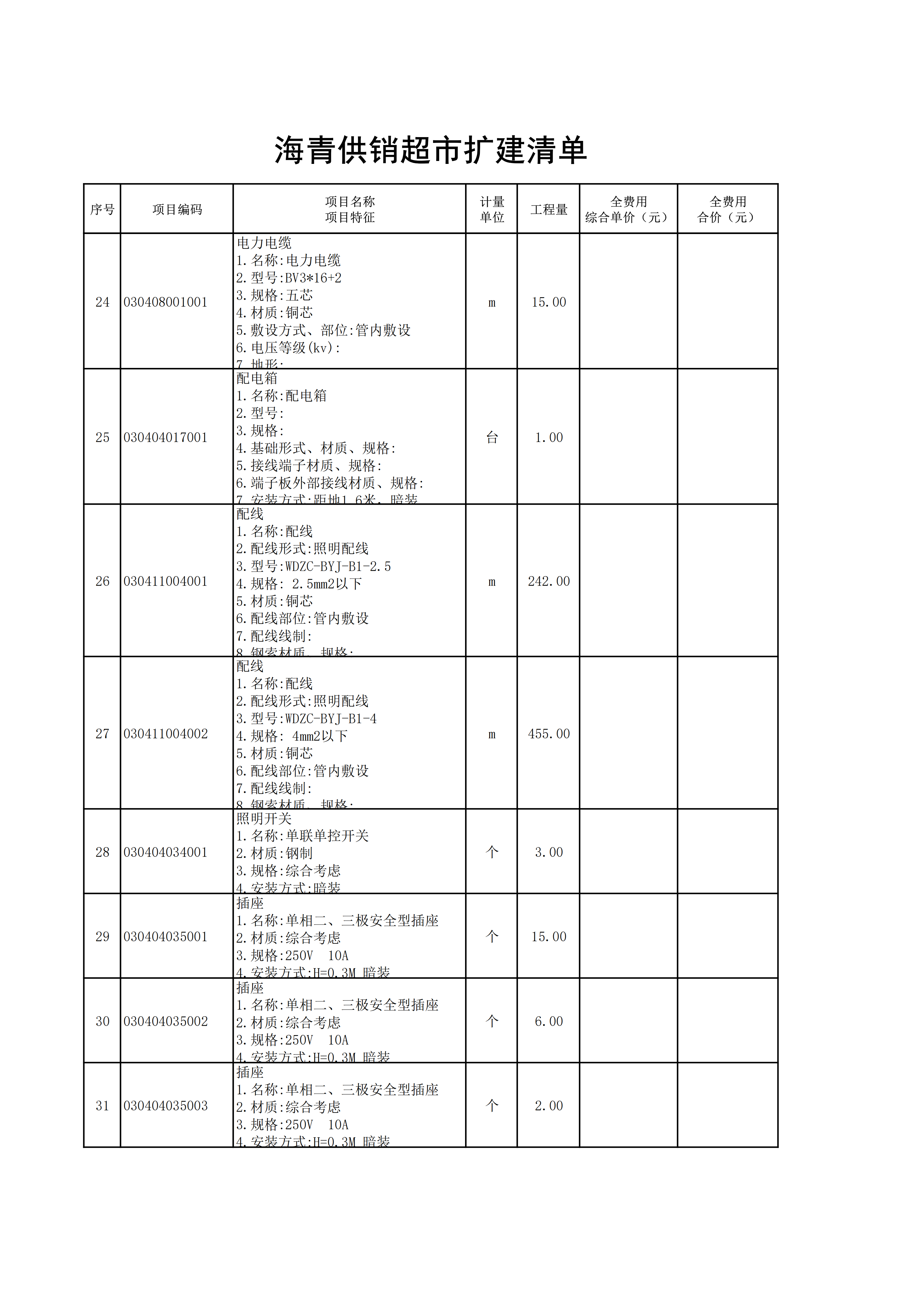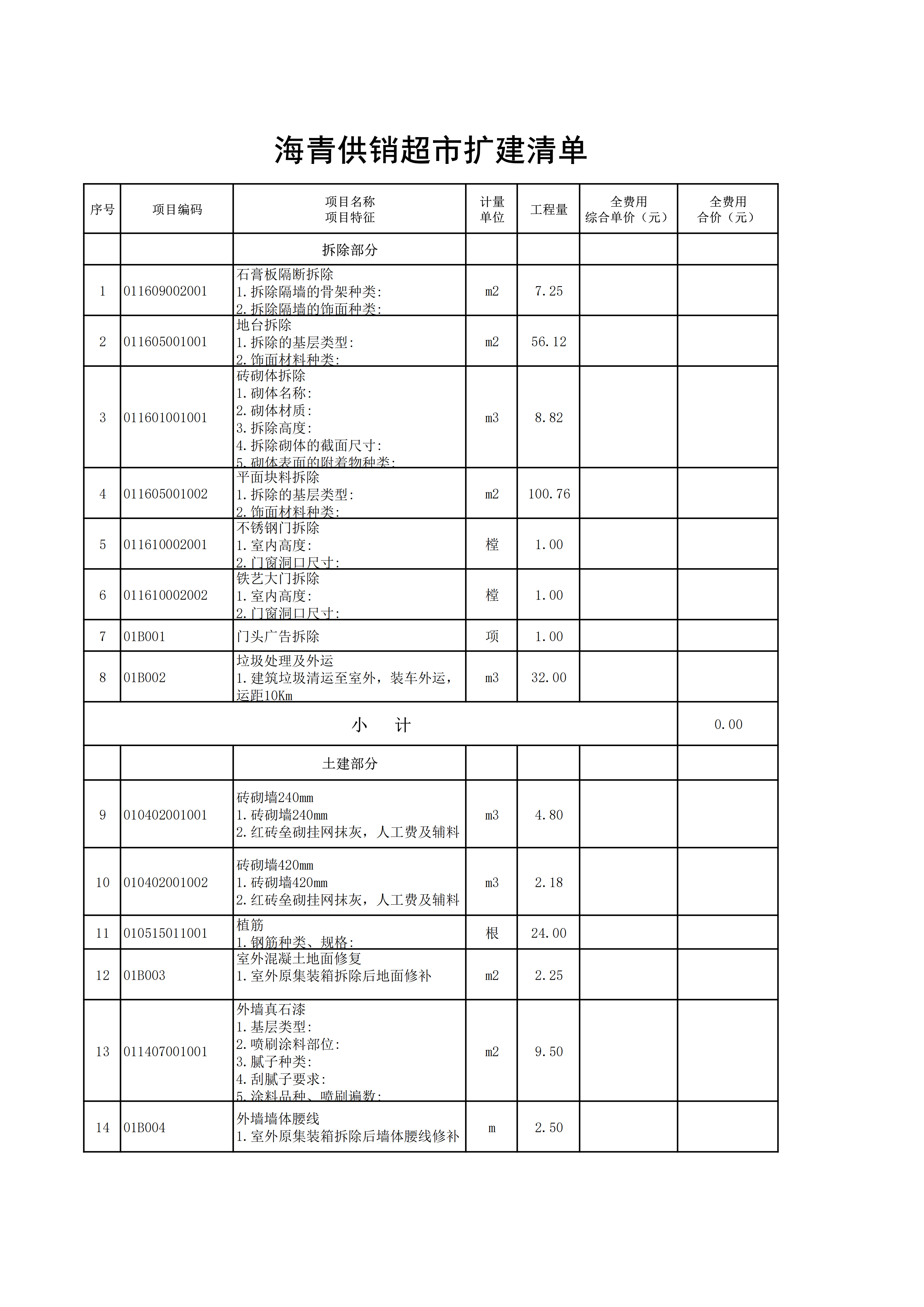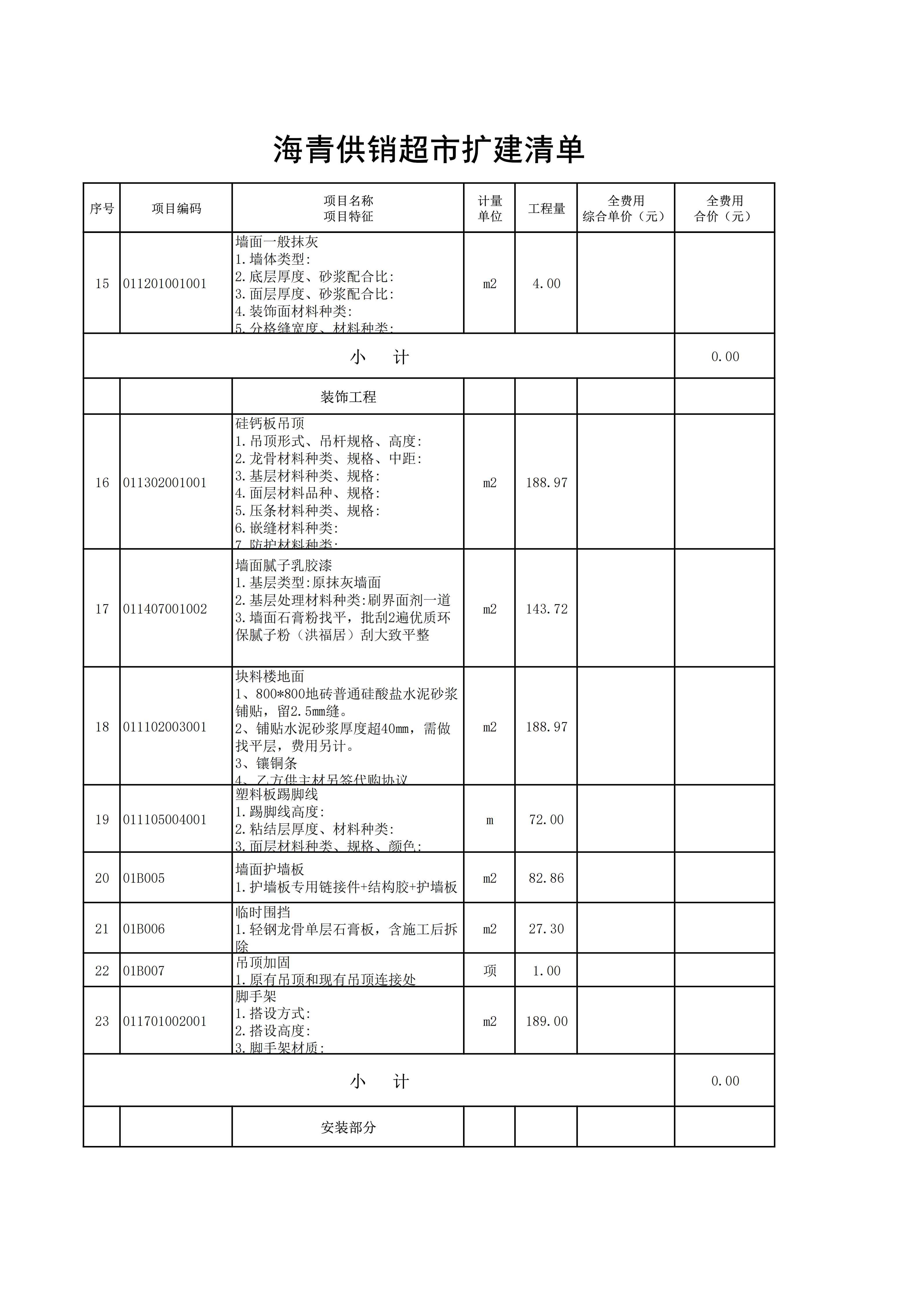 海青供销超市扩建需拆除原有的地台、间隔墙、门;室内铺设瓷砖,吊顶,墙面粉刷腻子,更换电线,安装摄像头,制定门头牌,安装货架,安装空调,更换门窗等。